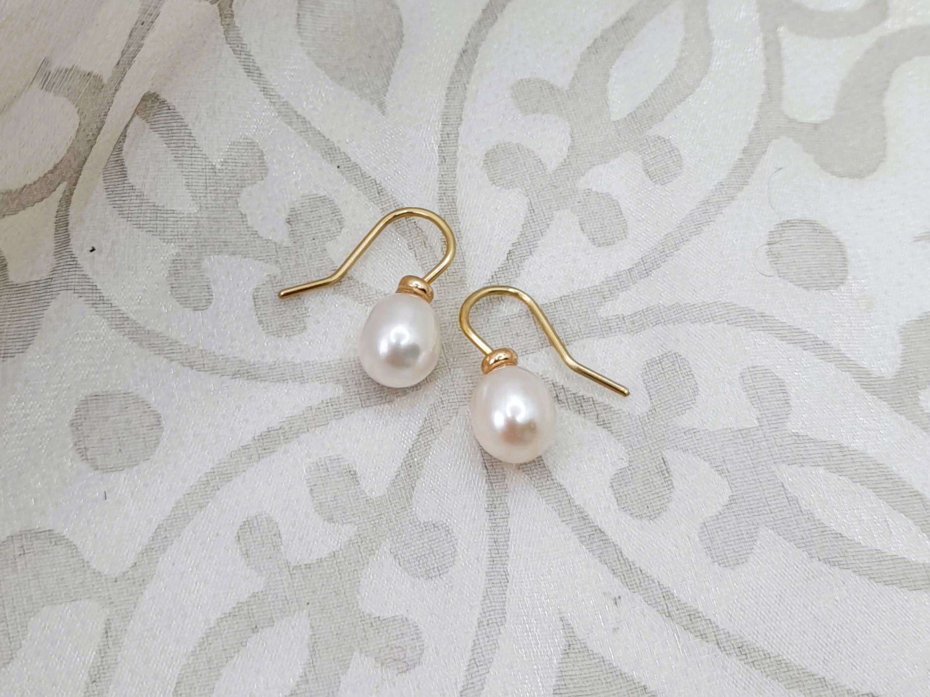 Graceful cultured freshwater naturally coloured pearl drop earrings with simple hoop fitting & rondelle in 9ct yellow gold.